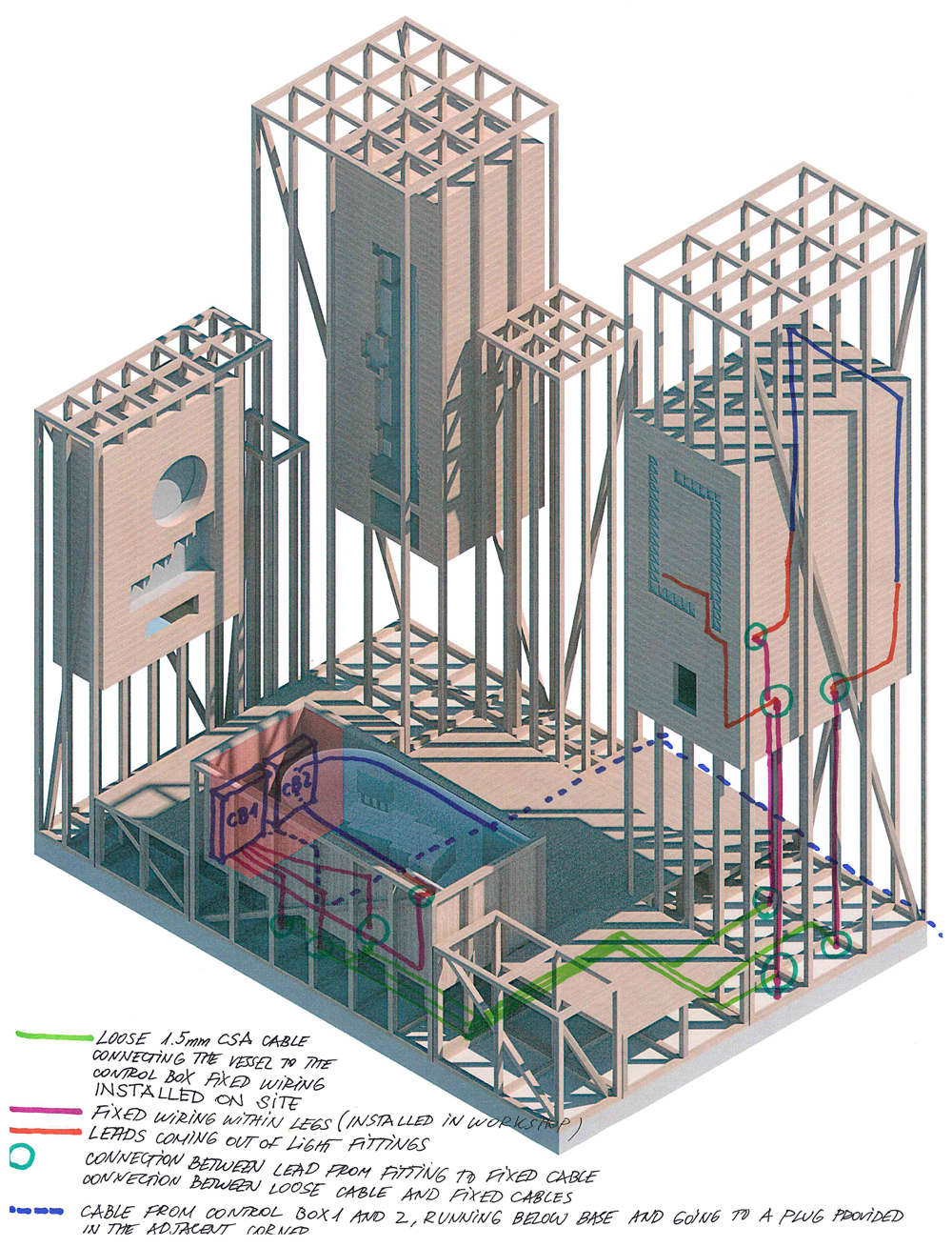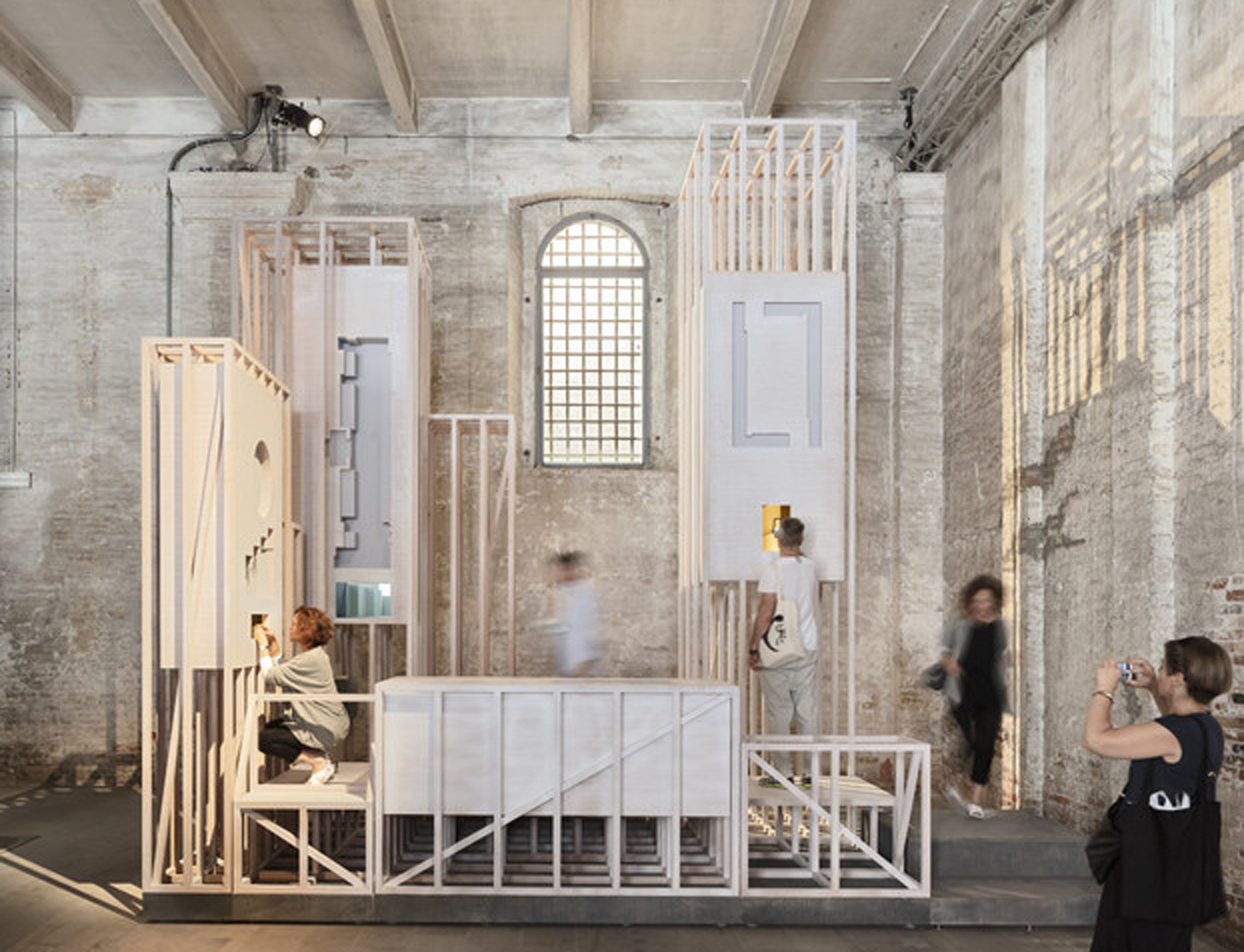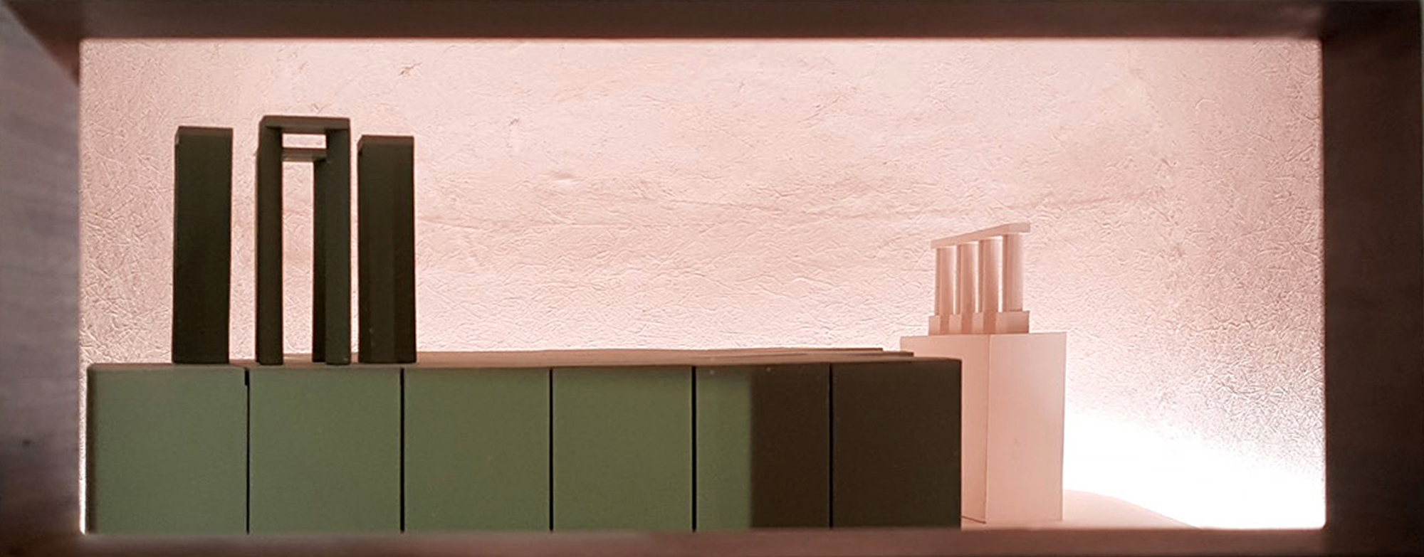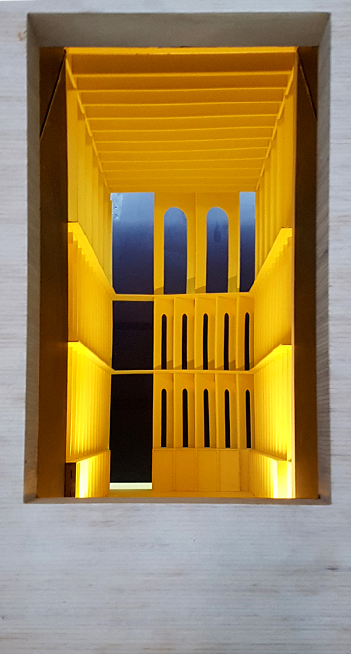 Architectural pratice Hall McKnight brought their projects to the Venice Biennale through an ingenuous display. Four vessels, held within the lattice-like timber framework, conceal in wooden chambers CNC cut models. The proposed spaces sit under a fibreglass casting of an infinity curve. Light Bureau used indirect light on the domes to create an artificial sky. The reflected illuminance on the scale-down buildings mimics daylight. A viewing mirror placed at 45 degree unveils a surreal perspective.