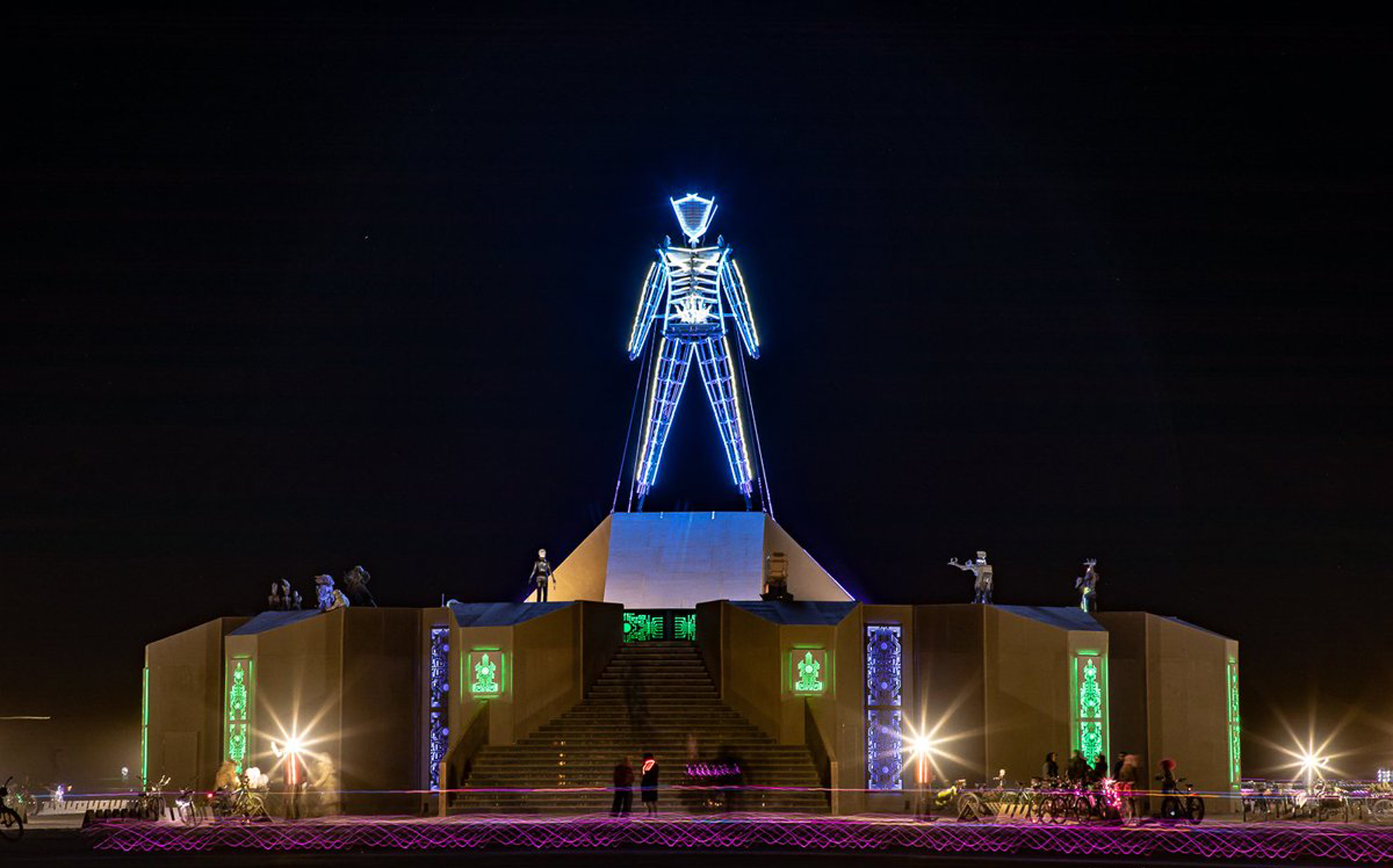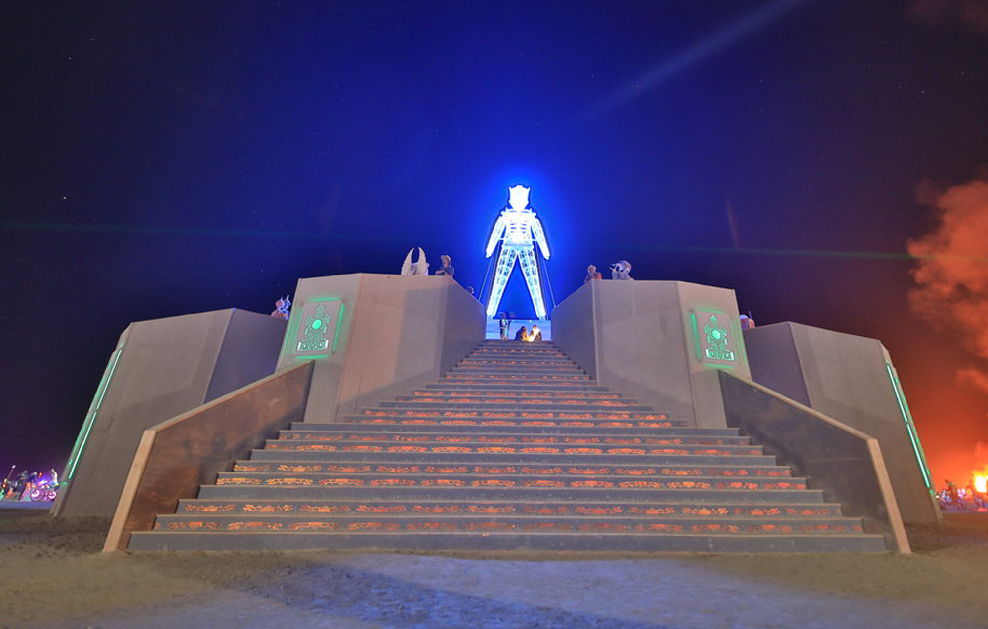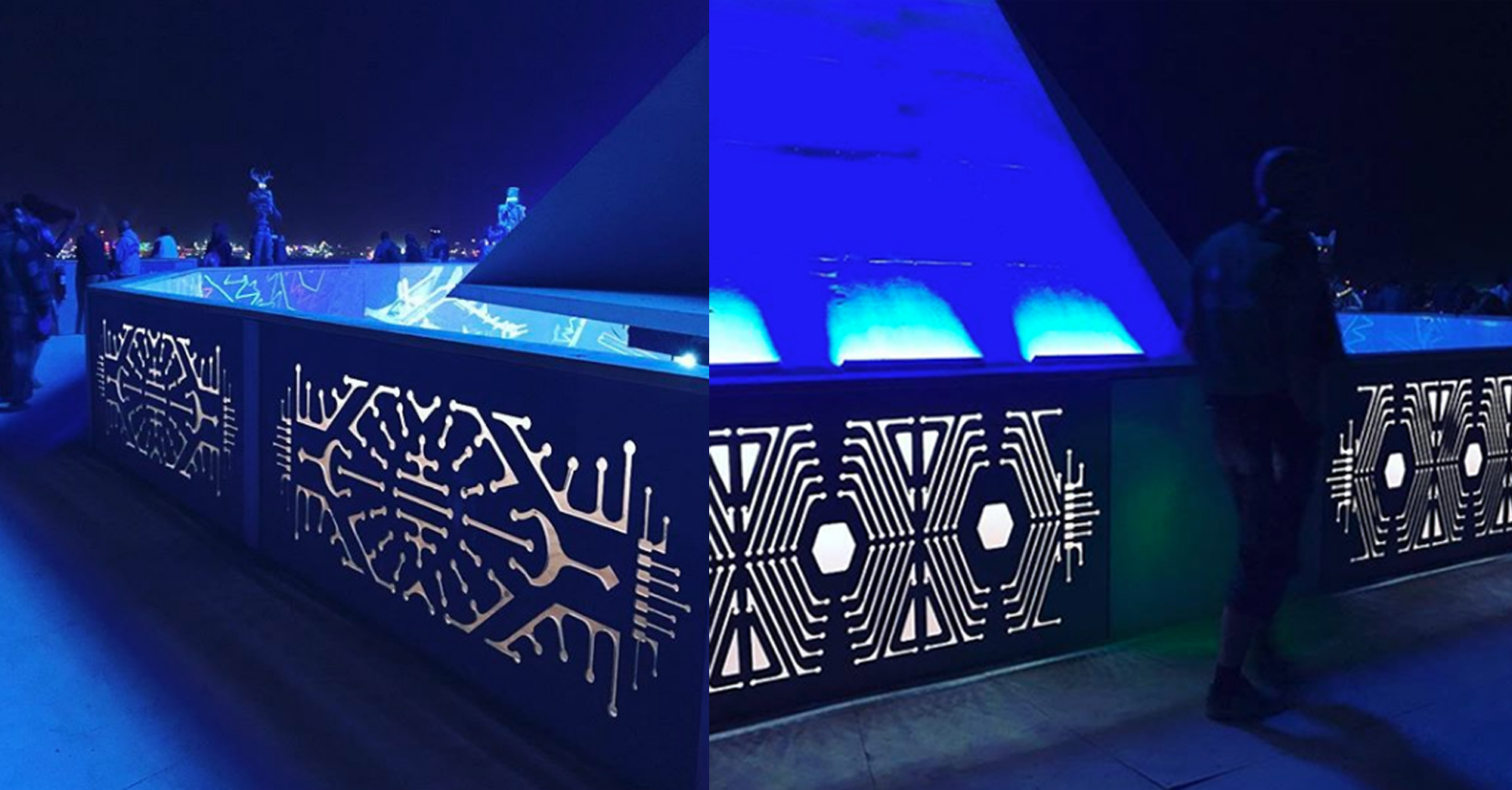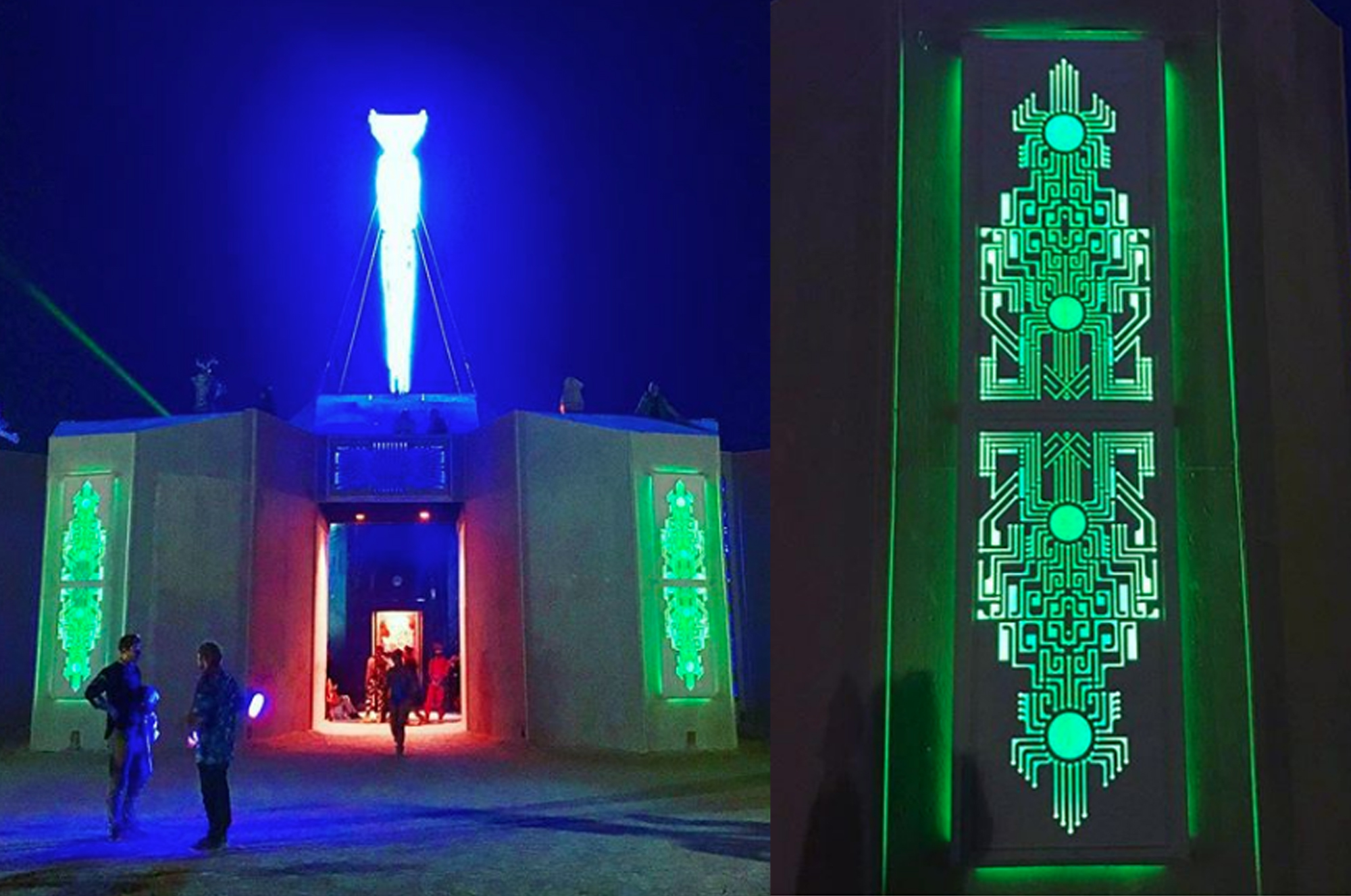 Burning Man 2018 in the Black Rock Desert of Nevada had for theme that year "I, robot". This year's Man had special significance, as it is the last one Burning Man co-founder Larry Harvey worked on before he passed away. Artist Kate Raudenbush designed the printed circuits inspired wood cuts and the lighting team backlit the panels with color changing LED lighting to reveal the patterns in the artworks placed on the facade, staircases and balustrade.