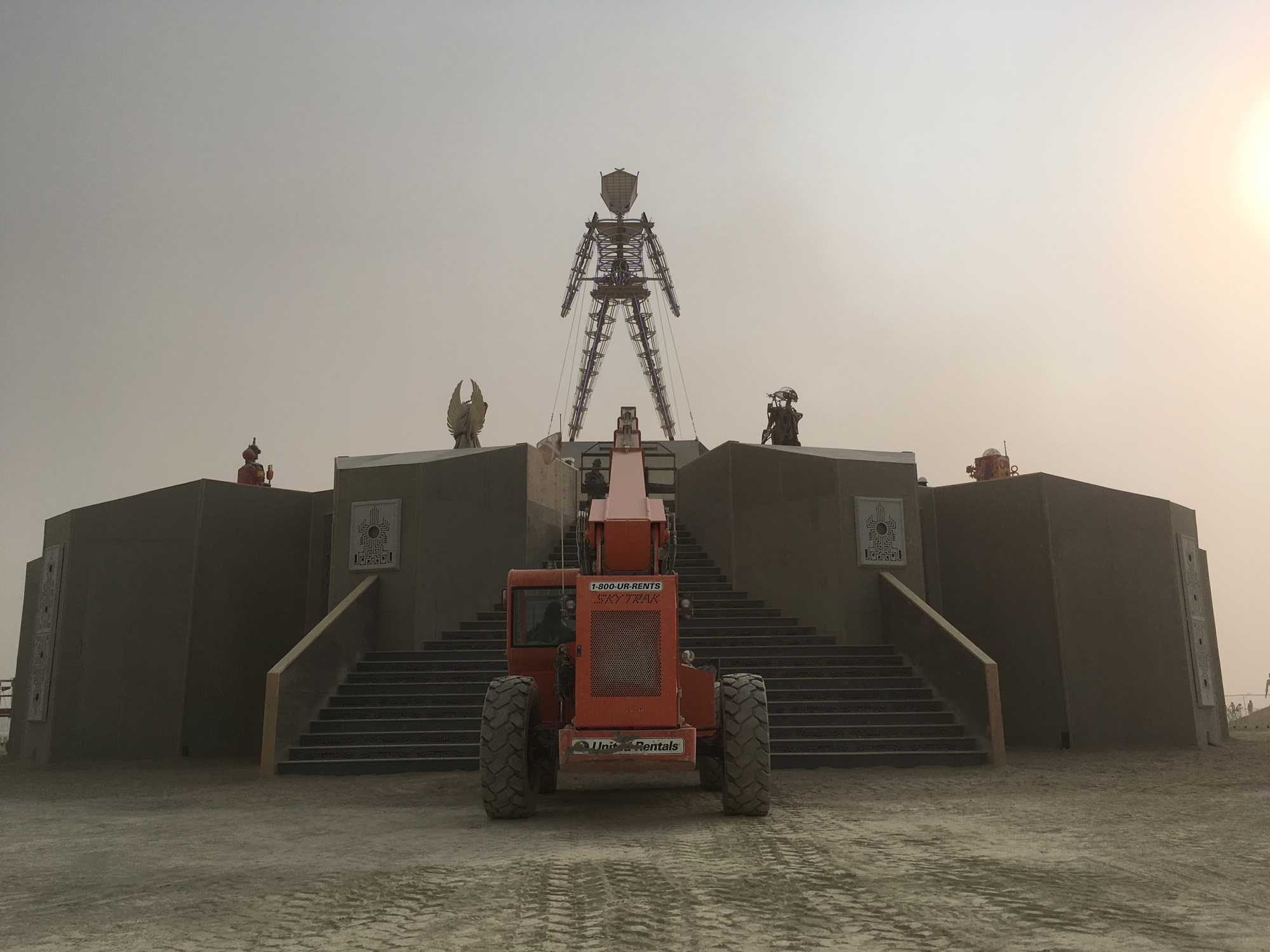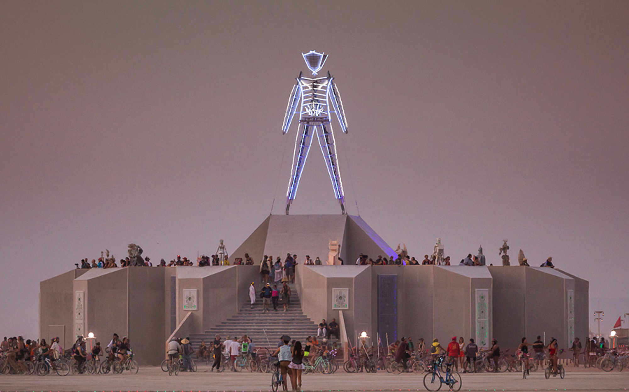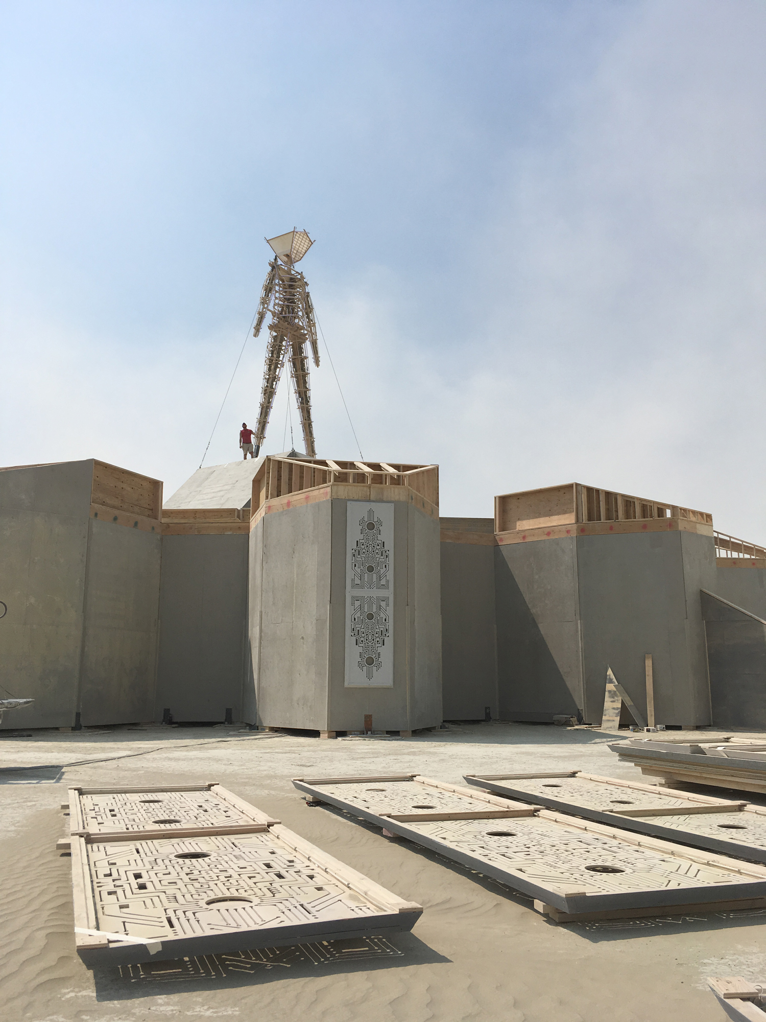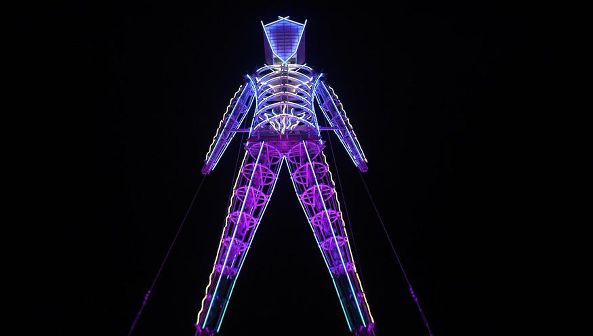 Burning Man 2018 in the Black Rock Desert of Nevada had for theme that year "I, robot". This year's Man had special significance, as it is the last one Burning Man co-founder Larry Harvey worked on before he passed away. Artist Kate Raudenbush designed the printed circuits inspired wood cuts and the lighting team backlit the panels with color changing LED lighting to reveal the patterns in the artworks placed on the facade, staircases and balustrade.
