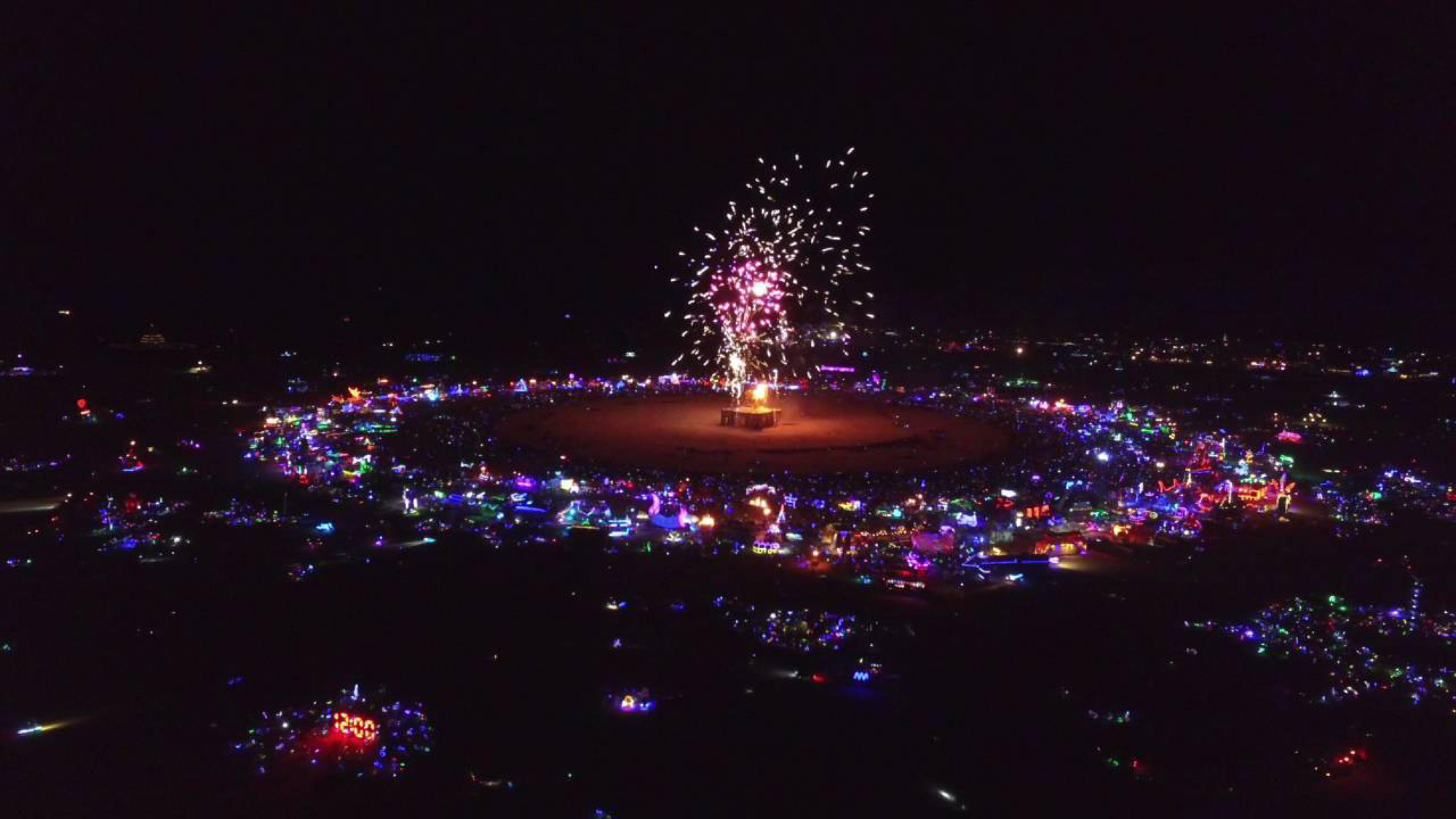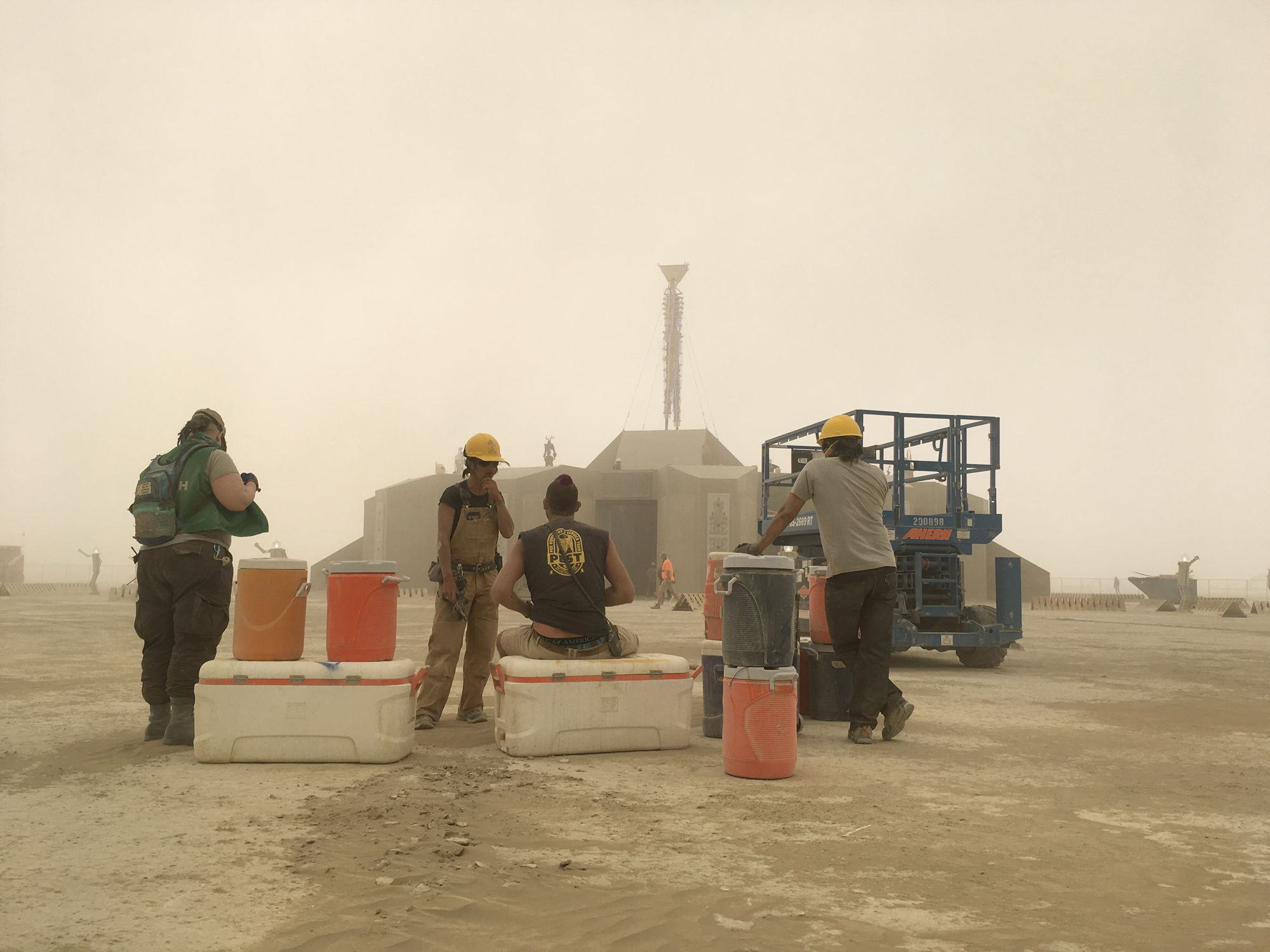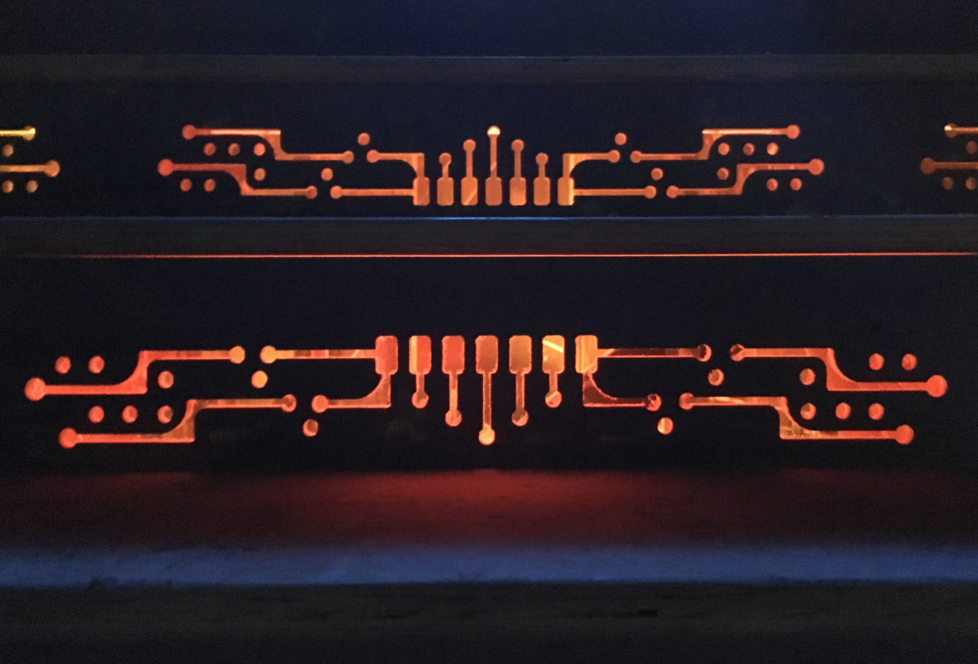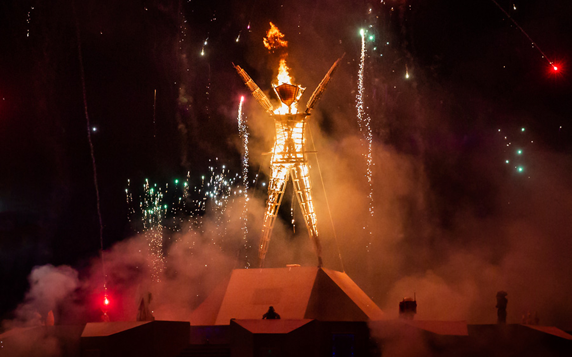 Burning Man 2018 in the Black Rock Desert of Nevada had for theme that year "I, robot". This year's Man had special significance, as it is the last one Burning Man co-founder Larry Harvey worked on before he passed away. Artist Kate Raudenbush designed the printed circuits inspired wood cuts and the lighting team backlit the panels with color changing LED lighting to reveal the patterns in the artworks placed on the facade, staircases and balustrade.