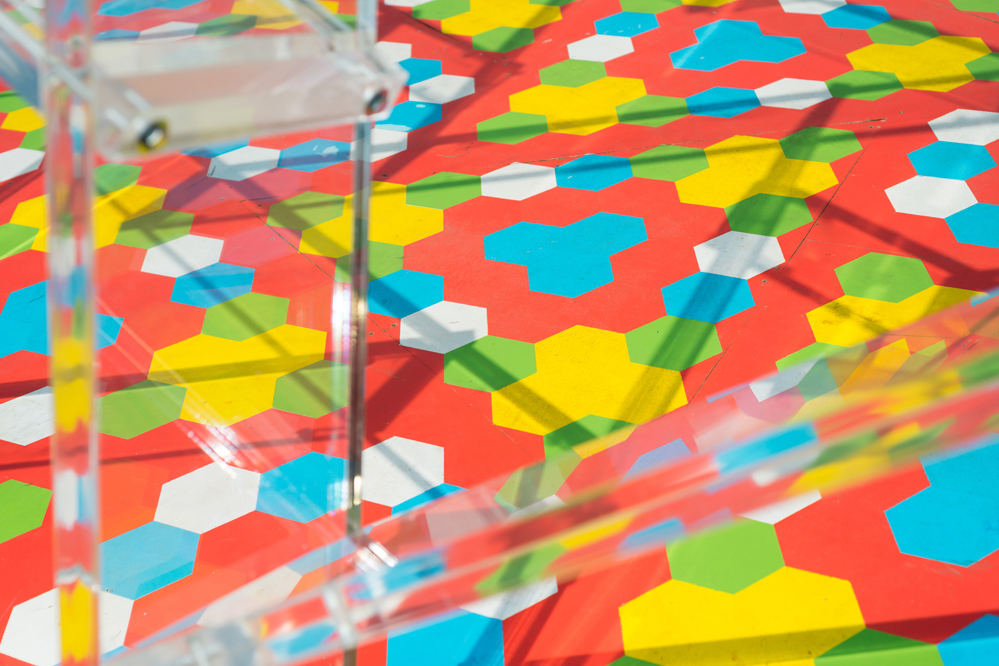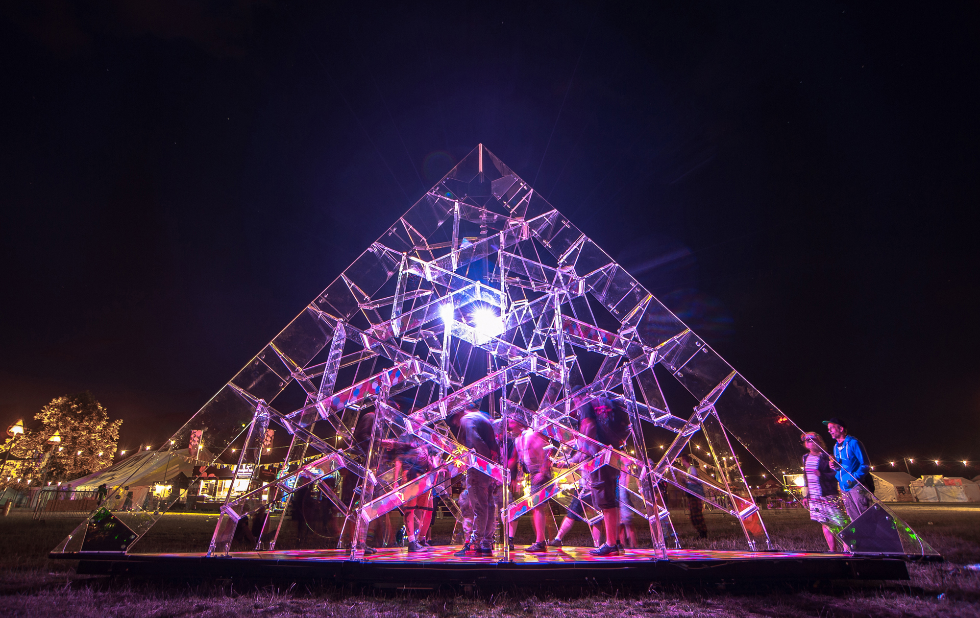 Luz is an interactive light installation conceived by 'les mechants': a collective of 6 architects, engineers and designers brought together by the voluntee to create an original experience for the Secret Garden Party and Burning Man festivals. Luz is a three sided pyramid composed of an interlocate pattern of acrylic spines. The colorful kaleidoscope flooring that mirrors the structure is pressure activated. The participants trigger a bespoke LED lighting that transform their perception of the mosaic tilling.