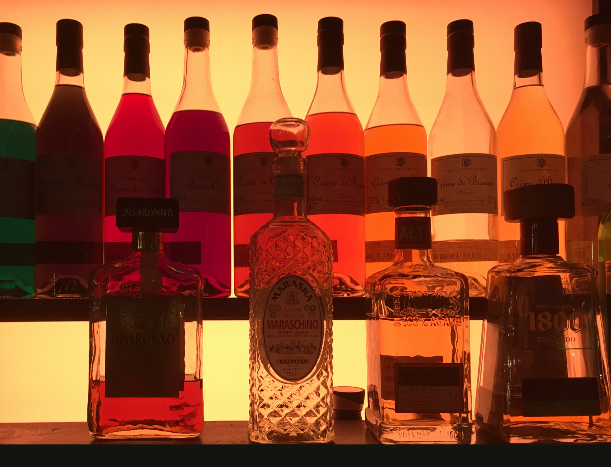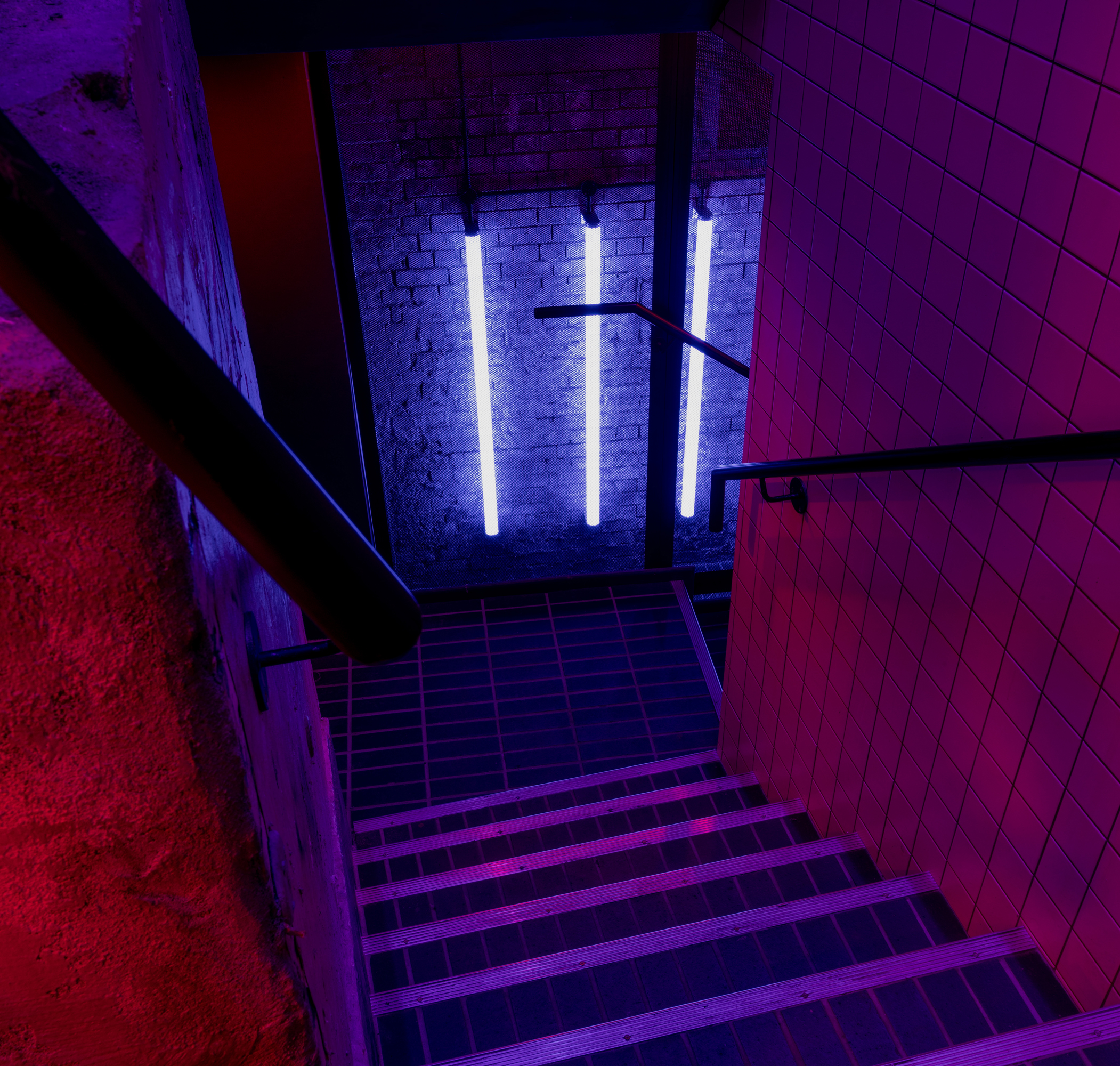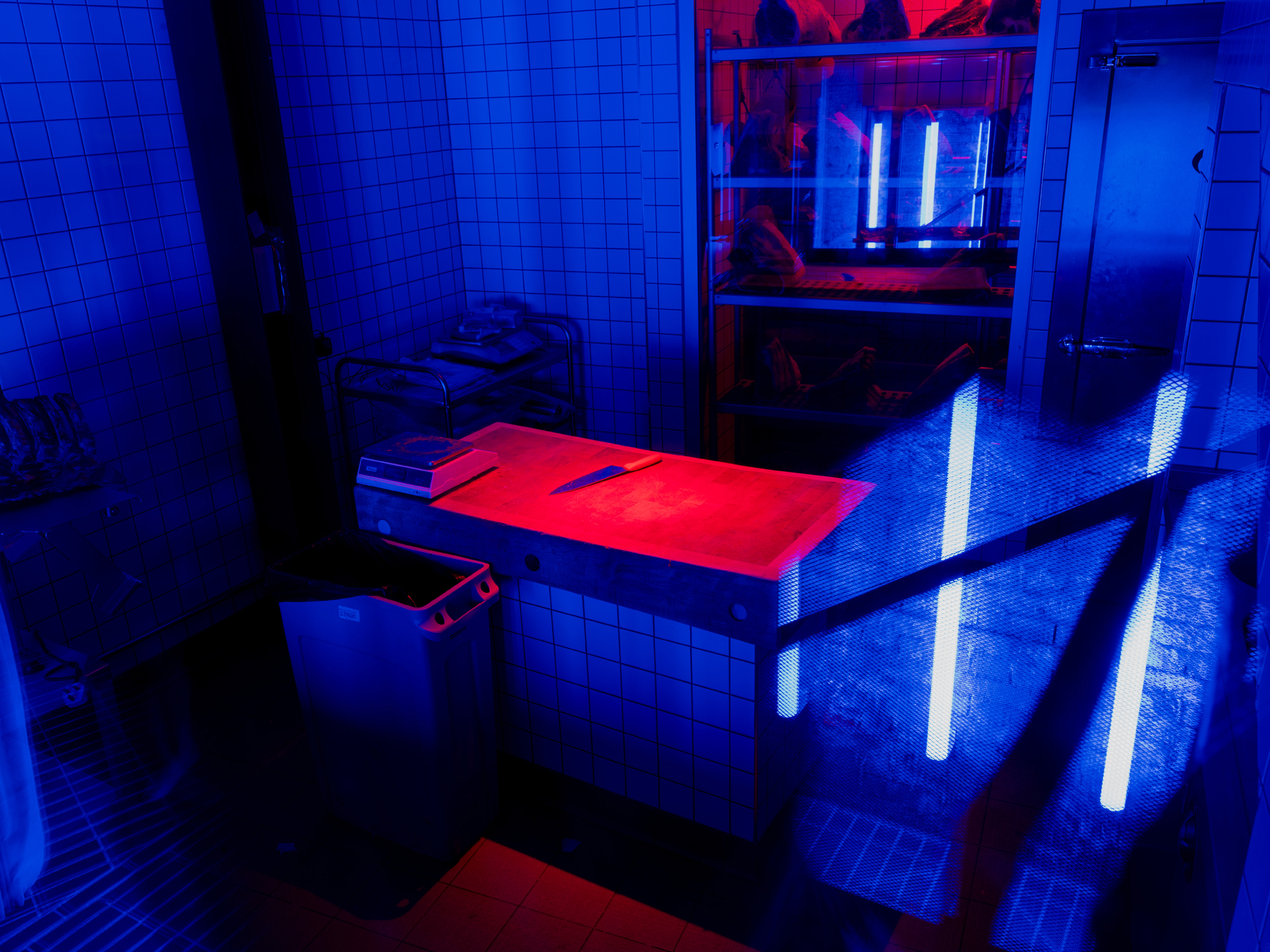 Downstairs to Sophie's Soho Steak House is the secretive speak-easy named after boxing impresario Jack Solomons. Customers must find their ways through Sophie's back of house to enter, passing the butcher block, staged with UV and red spot light to contrast with the felted inside. The hidden drinking establishment specialises in whisky and gin. The lighting atmosphere takes the tint of the amber drink so showgirls and boxers can relax. Behind the bar, an orange luminescent backdrop silhouettes the anonymous bartenders.